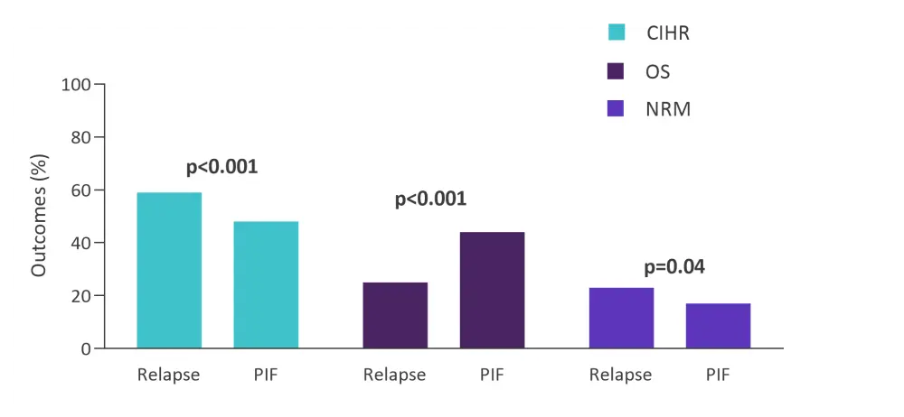 CIHR, cumulative incidence of hematologic relapse; HSCT, hematopoietic stem cell transplantation, NRM, non-relapse mortality; OS, overall survival; PIF, primary induction failure.