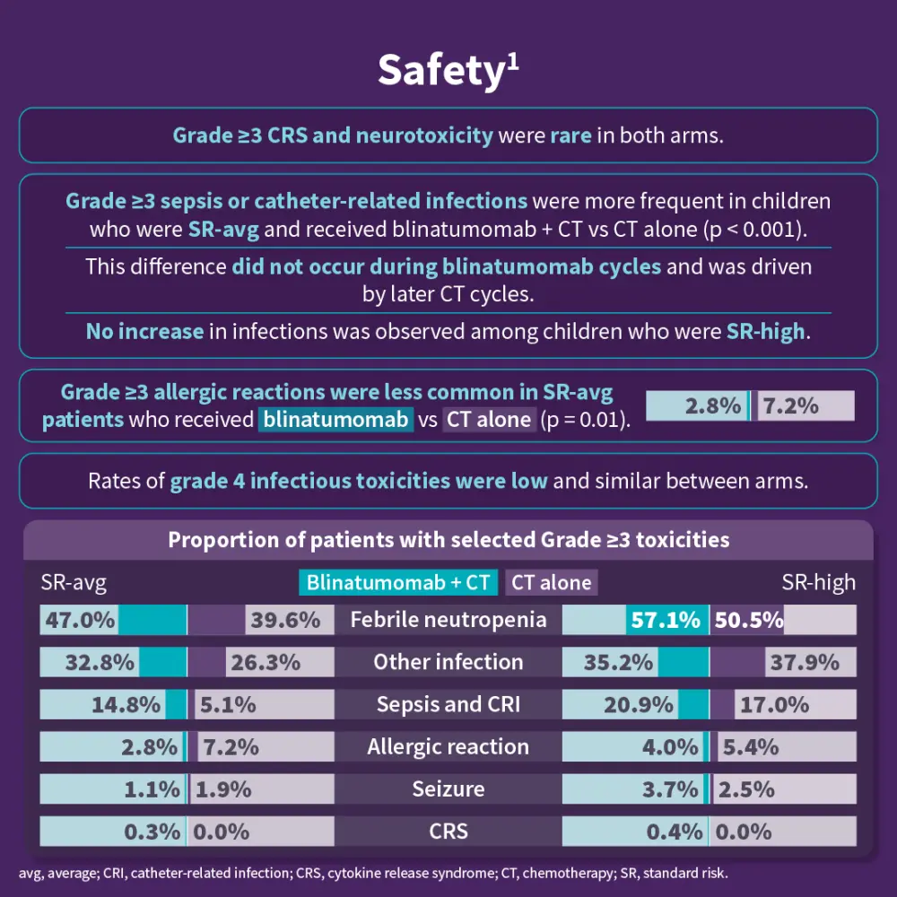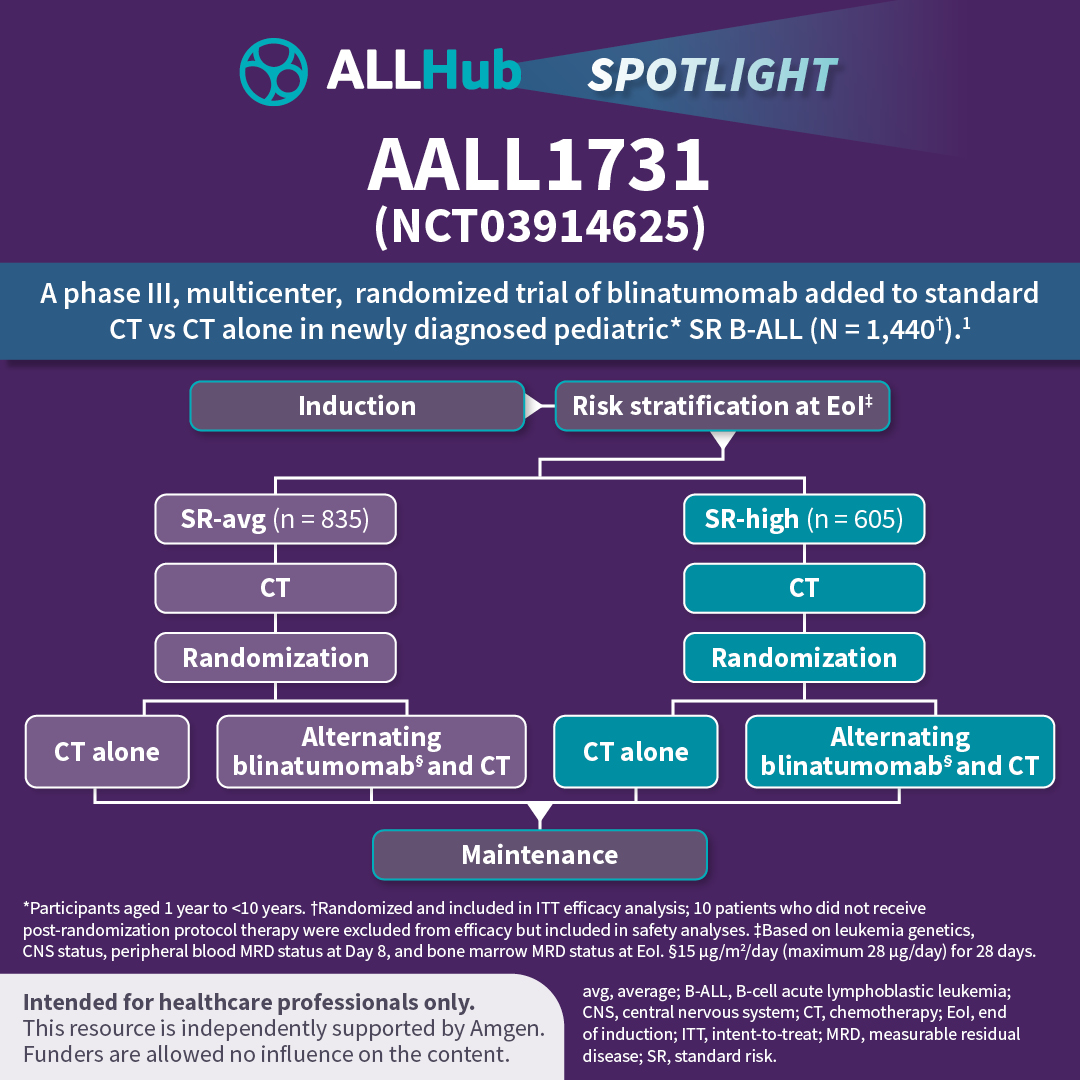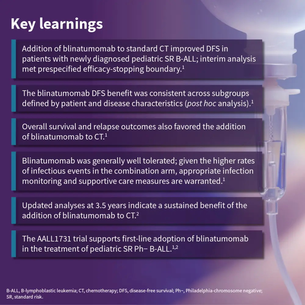 The randomized phase III AALL1731 (NCT03914625) trial assessed the efficacy and safety of adding blinatumomab and alternating with chemotherapy vs chemotherapy alone in the first-line consolidation phase in the treatment of pediatric patients aged 1 year to <10 years with newly diagnosed Philadelphia-chromosome negative (Ph−) standard-risk (SR) B-cell acute lymphoblastic leukemia.1