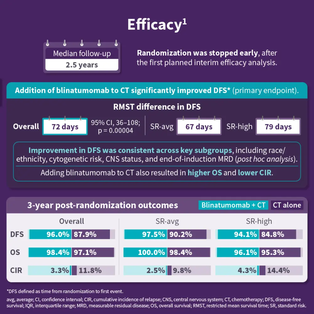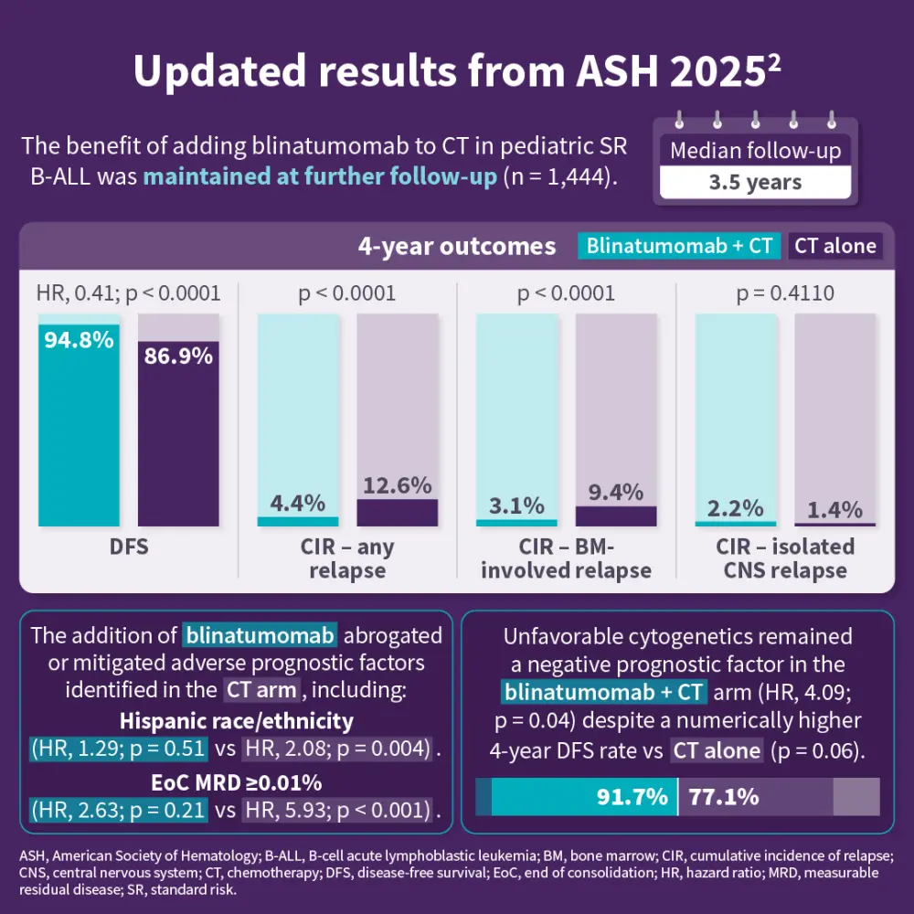 At the first efficacy interim analysis, with a median 2.5 years of follow-up, which included 1,440 randomized patients, data indicated a disease-free survival benefit with the addition of blinatumomab to chemotherapy, and randomization was stopped early.1 Results from this trial were published in the New England Journal of Medicine by Gupta et al.1 Updated results, with a median 3.5 years of follow-up, were presented by Gupta during the 67th American Society of Hematology (ASH) Annual Meeting and Exposition, December 6–9, 2025, Orlando, US, and demonstrated that the benefit of blinatumomab + chemotherapy was sustained in this patient population.2