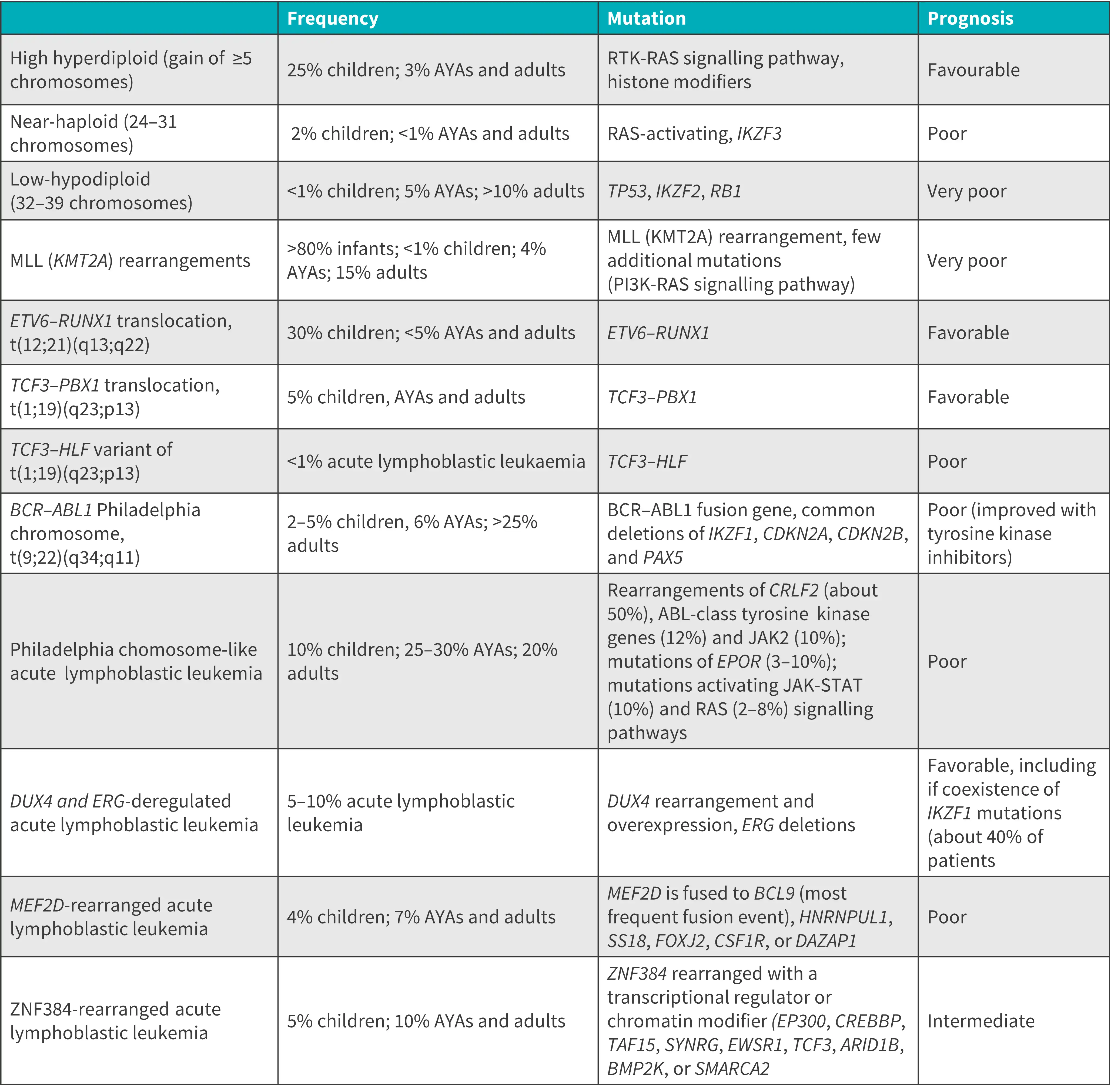 The markers for differential classification of B-ALL are CD19, CD20, CD22, CD24 and CD79a.9 The main genetic subtypes of B-ALL are described in the table below.
