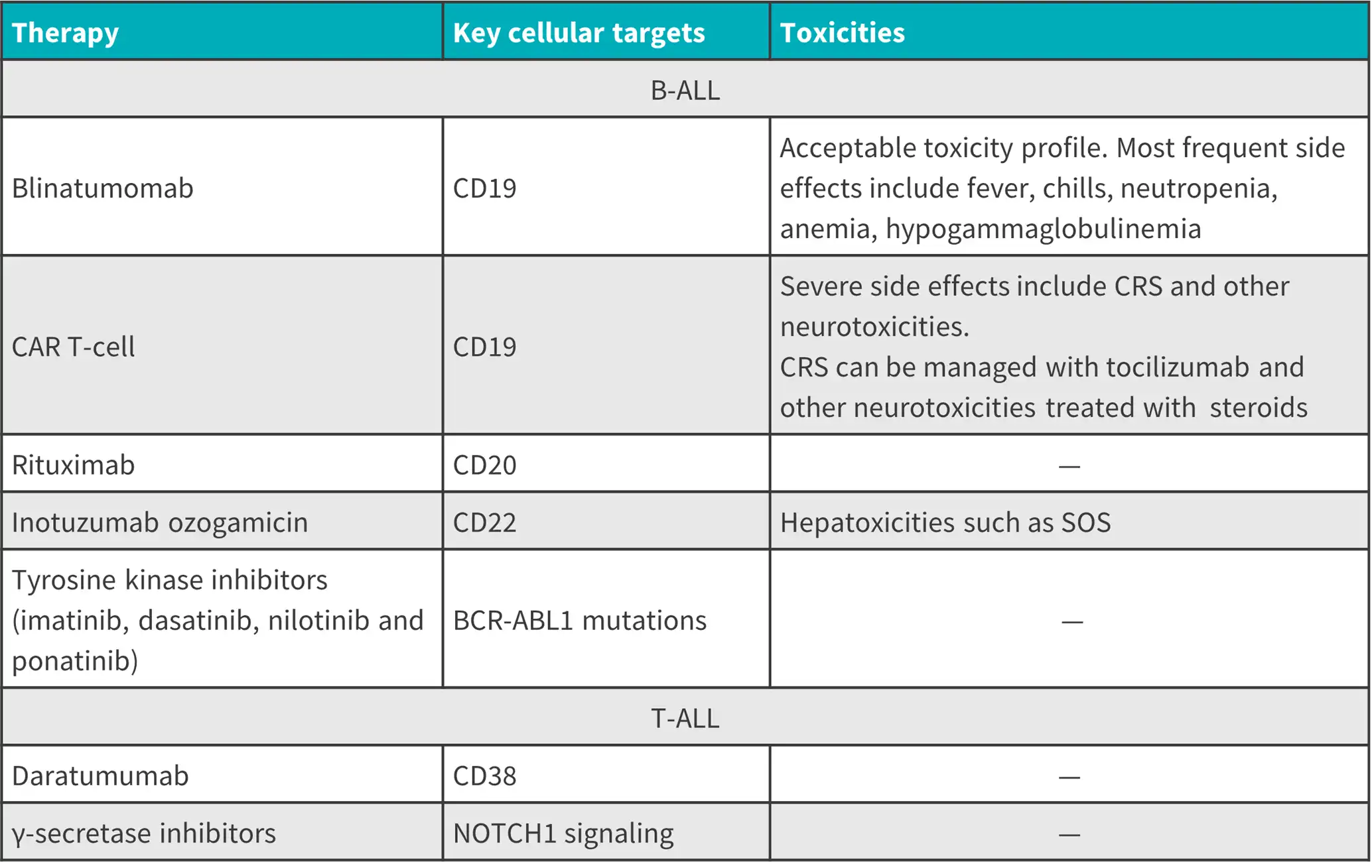 B-ALL, B-cell acute lymphoblastic leukemia; CAR, chimeric antigen receptor; CRS, cytokine release syndrome; SOS, sinusoidal obstruction syndrome; T-ALL, T-cell acute lymphoblastic leukemia.