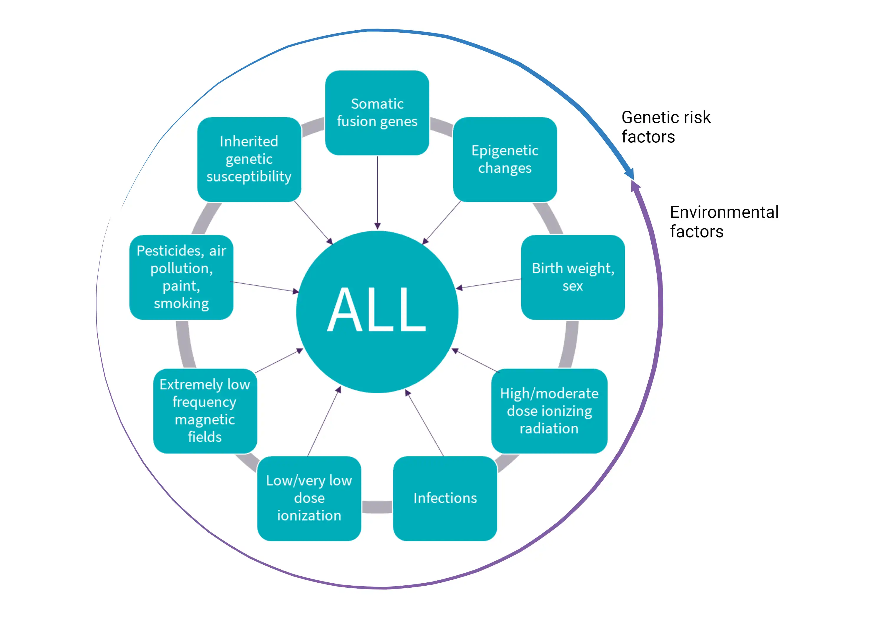 The etiology of ALL is currently unknown2; however, there are various environmental risk factors and several genetic syndromes that predispose some individuals to ALL (Figure 1)1: