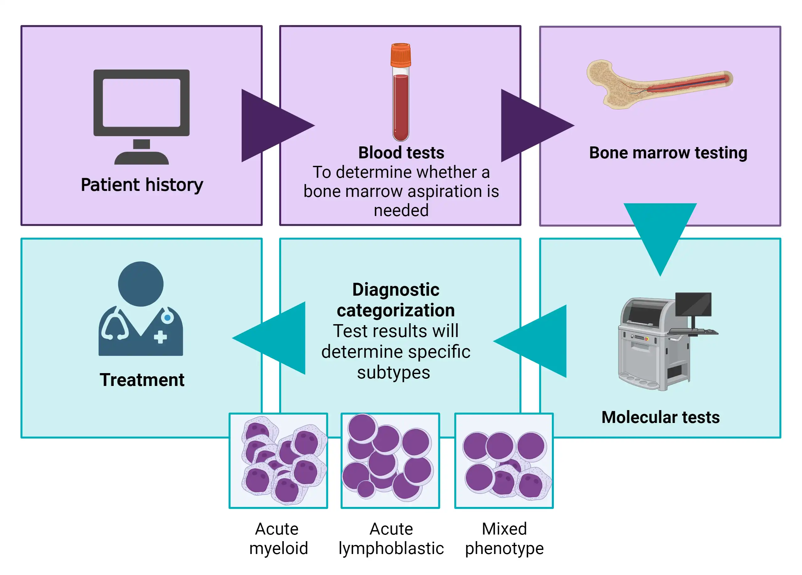 Diagnostic tests for ALL include a complete blood count, a peripheral blood smear, and a bone marrow biopsy. Laboratory tests include histochemical studies, cytogenetic testing, immunophenotyping, and specific molecular and genetic tests. Lumbar punctures are performed to investigate central nervous system (CNS) involvement. Imaging assessments, such as X-ray, computed tomography, magnetic resonance imaging and ultrasound, may also be performed during diagnosis.10,11 The diagnostic journey for patients with ALL is outlined below (Figure 6).