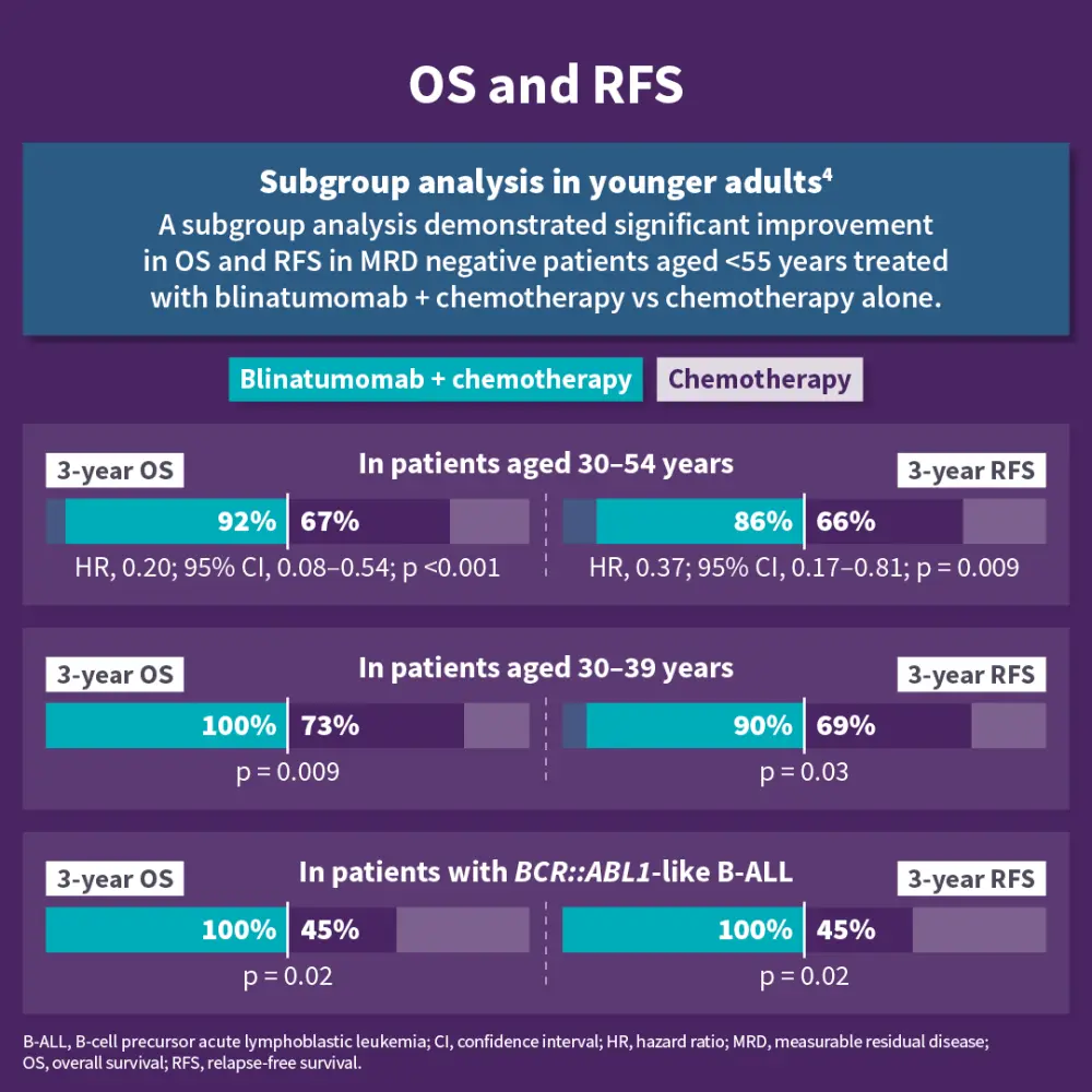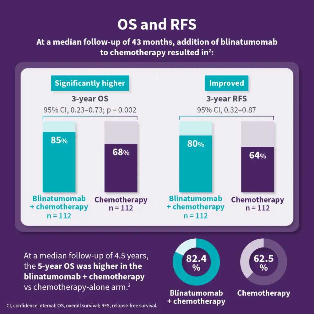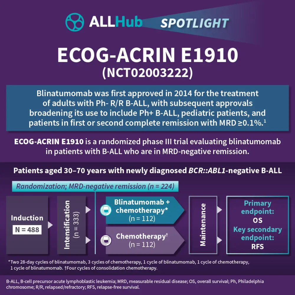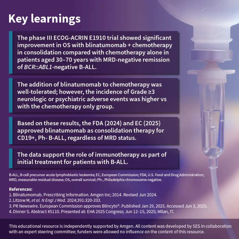 These results led to FDA (2024) and EC (2025) approvals of blinatumomab as consolidation therapy for CD19+ Ph- B-ALL, regardless of MRD status. The findings support the inclusion of immunotherapy in initial treatment for B-ALL, changing the frontline standard of care for patients with ALL.