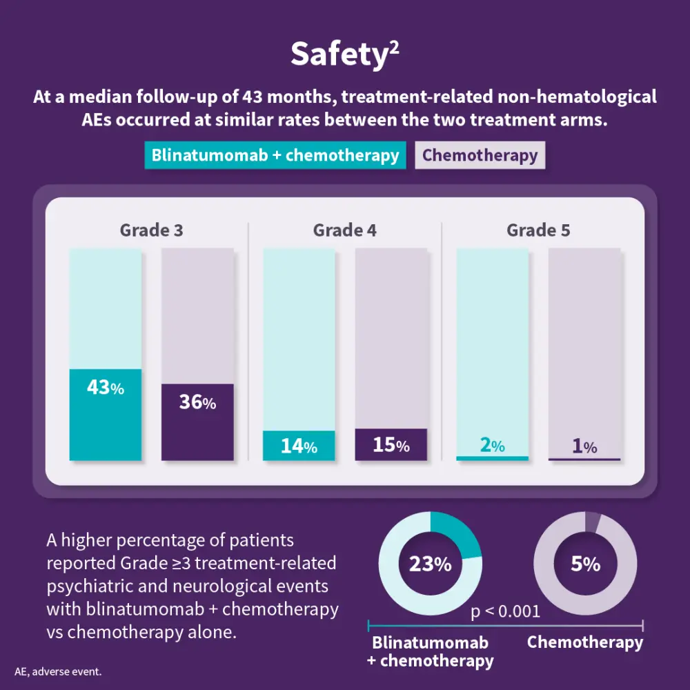 The phase III ECOG-ACRIN E1910 trial (NCT02003222) demonstrated that adding blinatumomab to consolidation chemotherapy significantly improved 3-year overall survival (85% vs 68%) and improved relapse-free survival (80% vs 64%) compared with chemotherapy alone in patients aged 30–70 years with newly diagnosed BCR::ABL1-negative B-cell precursor acute lymphoblastic leukemia (B-ALL) in MRD-negative remission. With a median follow-up of 43 months, the combination therapy showed a higher incidence of Grade 3 non-hematologic adverse events and treatment-related psychiatric or neurological events (43% vs 36% and 23% vs 5%, respectively).