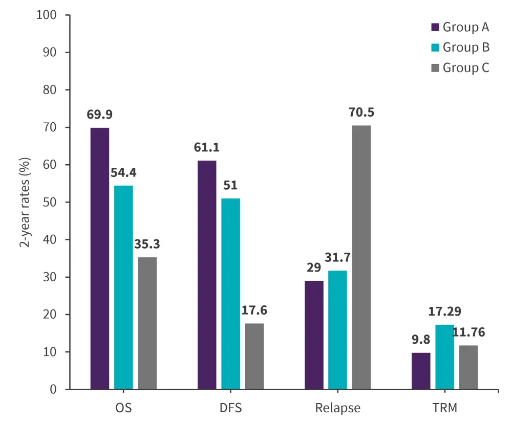 Figure 1. 2-year OS, DFS, relapse and TRM in Group, A, B, and C*
