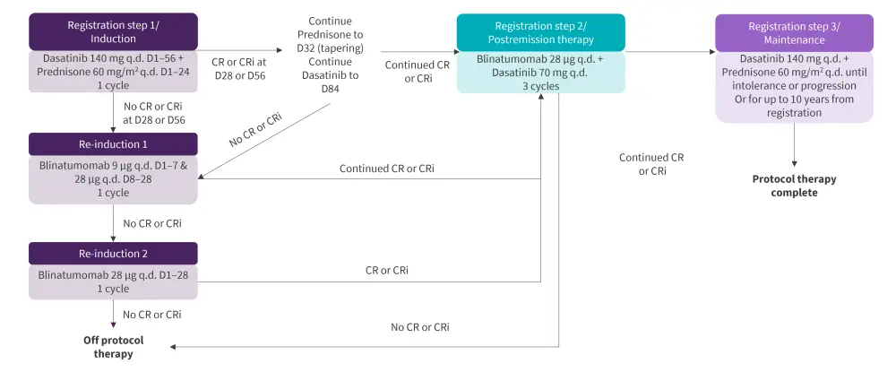 The induction therapy consisted of dasatinib/prednisone followed with post-remission therapy (PRT) with blinatumomab/dasatinib and maintenance with dasatinib/prednisone. The detailed treatment schema is illustrated in Figure 1. The response was assessed at Days 28, 56, and 84; additional time points were dependent on response. MRD was assessed centrally by 8-color flow cytometry at Day 28 and MRD negativity was defined as <0.01%.