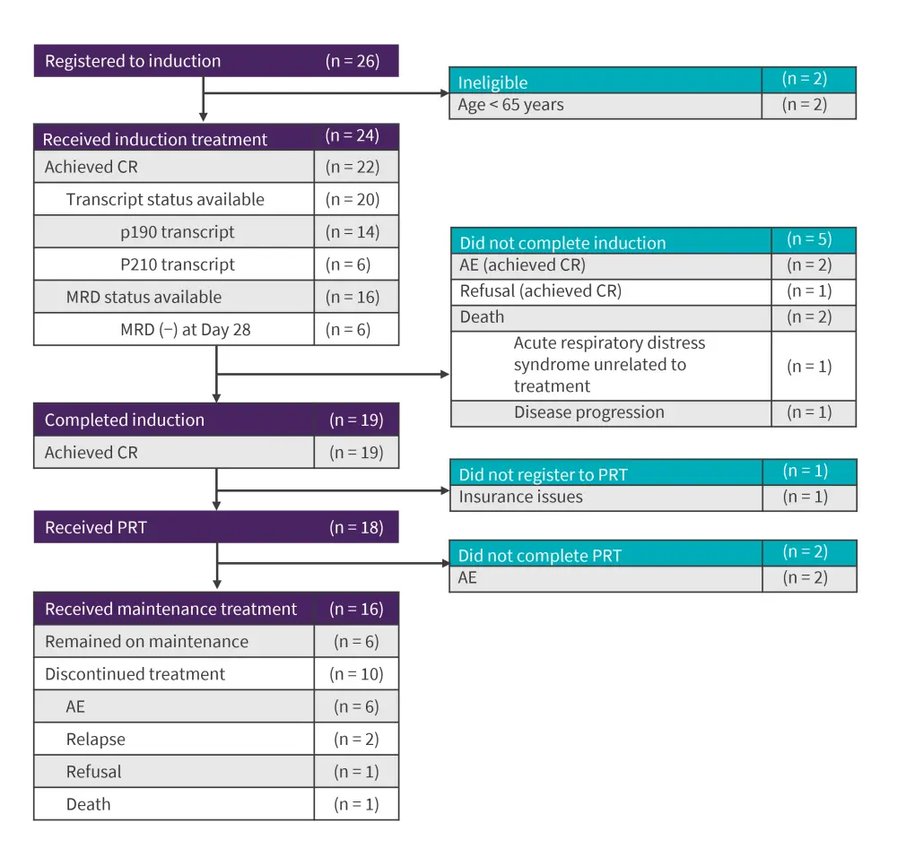 AE, adverse event; CR, complete remission; MRD, measurable residual disease; PRT, post-remission therapy.