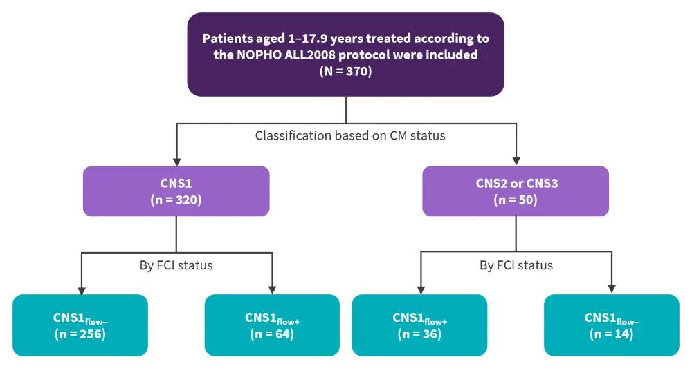 The study endpoints were the association between CNS leukemia by FCI at diagnosis and the risk of CNS toxicities; the association of CNSflow+ with CNS toxicity was also tested.