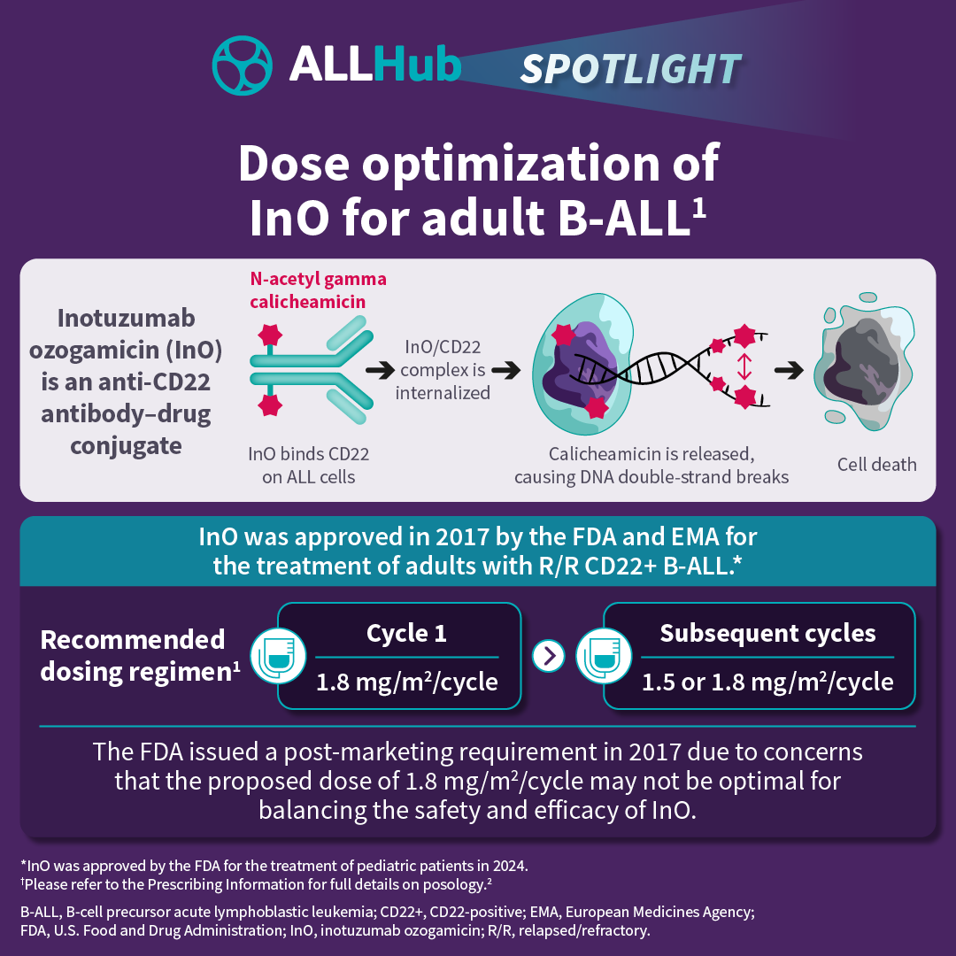 Inotuzumab ozogamicin was approved by the FDA and EMA in 2017 for the treatment of adults with relapsed/refractory CD22-positive B-cell precursor acute lymphoblastic leukemia. The FDA issued a post-marketing requirement due to concern that the proposed starting dose of 1.8 mg/m2/cycle of inotuzumab ozogamicin may not be optimal. The analysis, presented at ASH 2024 by DeAngelo, quantitatively measured the optimal trade-off between safety and efficacy using pooled data from the B1931010 and INO-VATE studies as well as data from the B1931030 study. These analyses support the current FDA-approved higher dose of 1.8 mg/m2/cycle, compared with the lower dose of 1.2 mg/m2/cycle, in balancing the efficacy and safety of inotuzumab ozogamicin in adult patients with relapsed/refractory acute lymphoblastic leukemia.