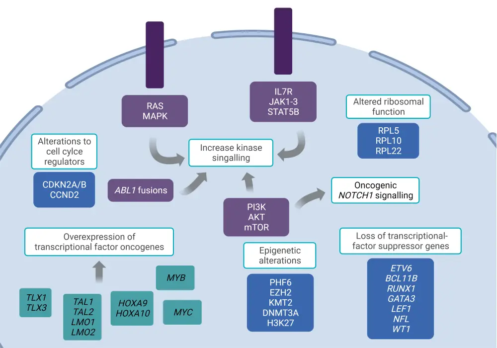 Increased kinase signaling due to mutations in the components of the IL7R/JAK/STAT, PI3K/AKT/mTOR, RAS/MAPK, and ABL kinase pathways, are involved in T-ALL pathogenesis (Figure 3).3