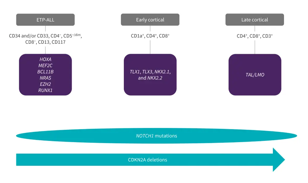 T-ALL can be subclassified into early T-cell precursor (ETP), early cortical, and late cortical based on the unique immunophenotypic and gene expression signatures associated with different stages of arrest within the thymocyte development process (Figure 1).1