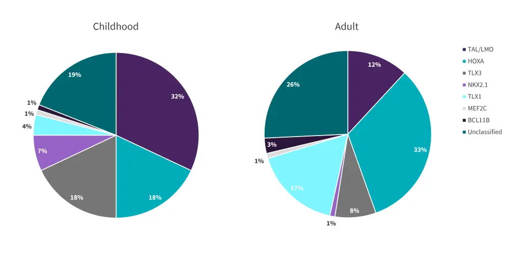 HOXA-positive T-ALL represents another genetic subgroup of T-ALL, related to a cluster of genes including HOXA, KMT2A, or MLLT10; this specific subtype is more commonly observed in adults compared with children (Figure 3). Unfavorable prognostic outcomes have been consistently shown within several groups of patients with this subtype.3