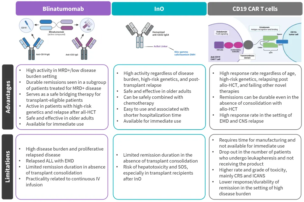 Figure 2. Advantages and limitations of approved novel immunotherapies in R/R B-ALL*