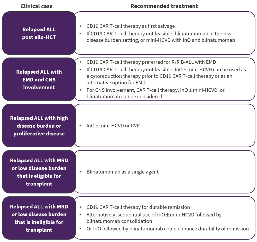 InO ± mini-HCVD followed by blinatumomab consolidation could be an option in a low disease burden setting or patients with transplant ineligible R/R ALL, as discussed above.1 Mini-hyperCVAD (cyclophosphamide, vincristine, doxorubicin, and dexamethasone) with a reduced-dose inotuzumab is a salvage therapy often used in advanced B-ALL for patients with high disease burden or as a bridging therapy for disease control prior to lymphodepletion in CAR T-cell therapy.1,2