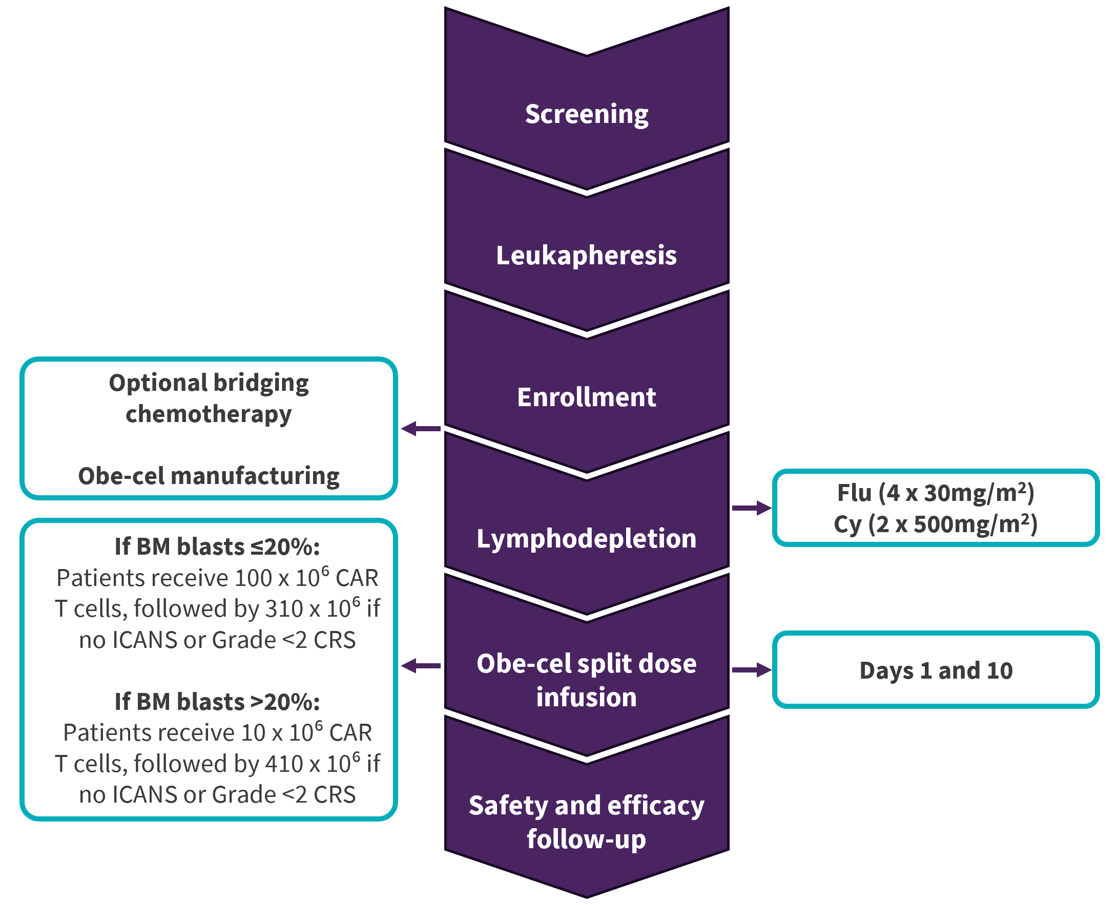 BM, bone marrow; CAR, chimeric antigen receptor; CRS, cytokine release syndrome; Cy, cyclophosphamide; DLT, dose-limiting toxicity; Flu, fludarabine; ICANS, immune effector cell-associated neurotoxicity; obe-cel, obecabtagene autoleucel.