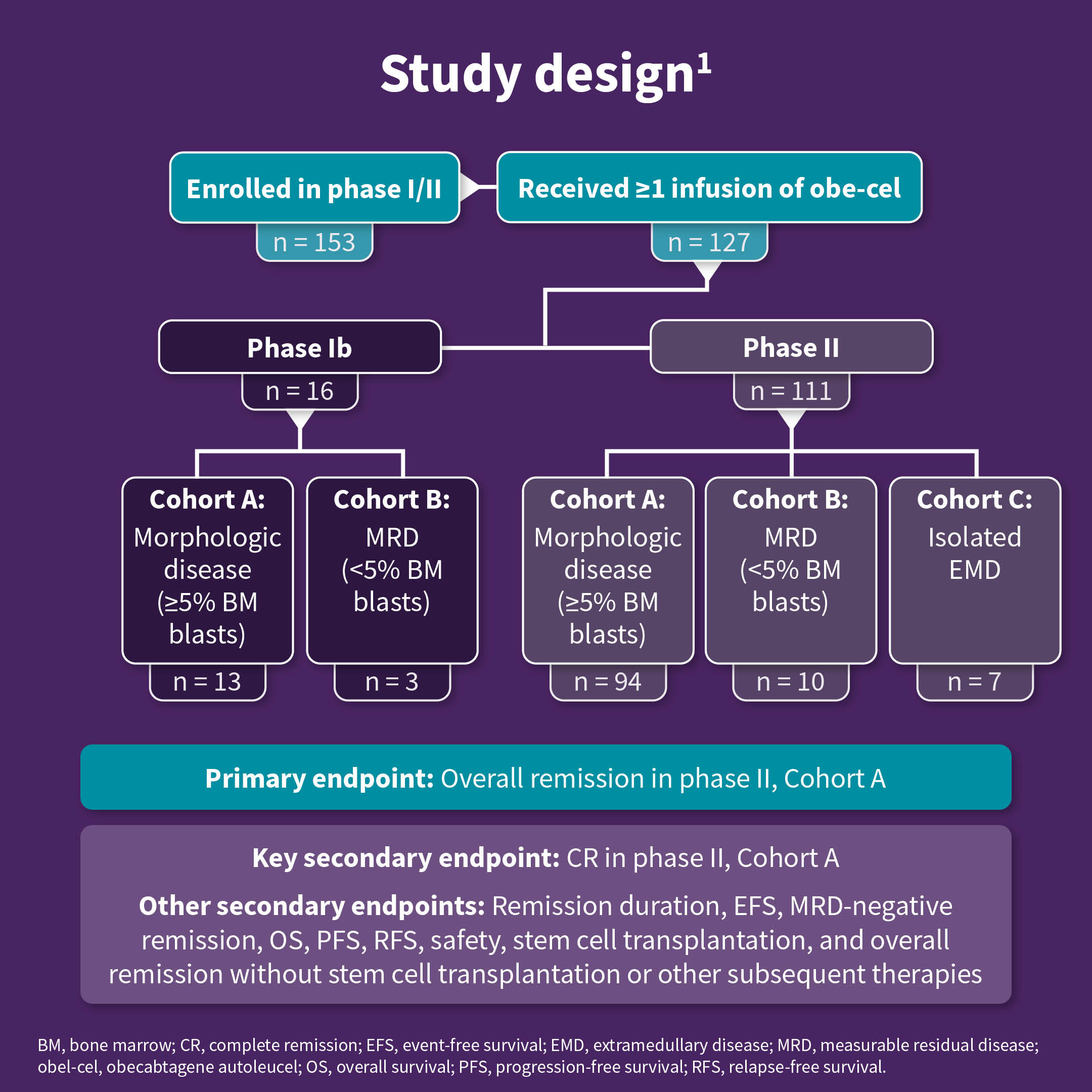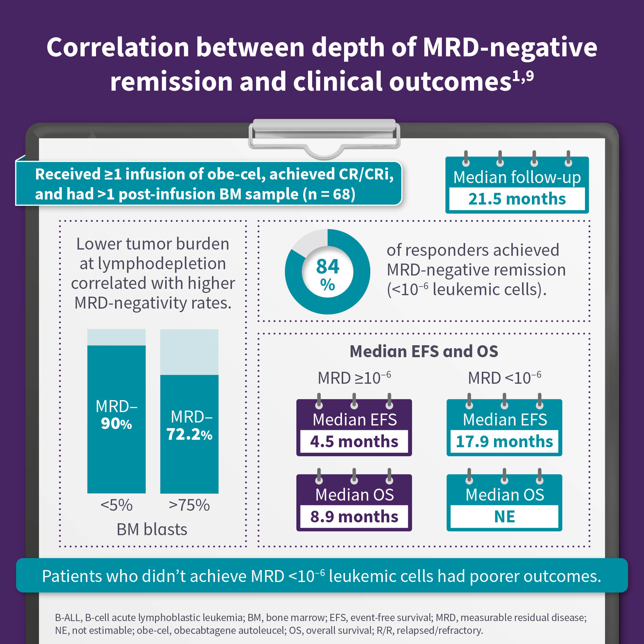 Obecabtagene autoleucel (obe-cel) is an autologous, anti-CD19 CAR T-cell therapy that is approved for the treatment of adults with R/R B-ALL, based on promising outcomes from the FELIX trial. The FELIX phase I/II, multicenter, single-arm study evaluated the safety and efficacy of obe-cel in adults with R/R B-ALL. Results from the FELIX trial showed obe-cel was associated with durable responses, with a low incidence of Grade ≥3 immune-related toxic effects. Furthermore, obe-cel treatment induces a high incidence of MRD-negative remission (<10⁻⁶ leukemic cells), which predicts better clinical outcomes and supports its use in adults with R/R B-ALL.