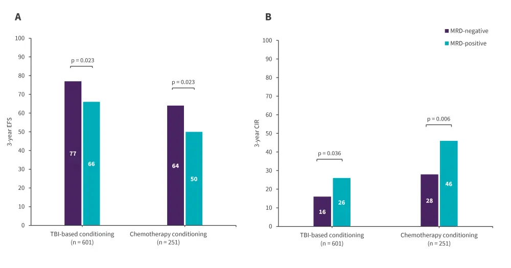 Figure 2. A 3-year EFS and B CIR by MRD status across conditioning regimens*