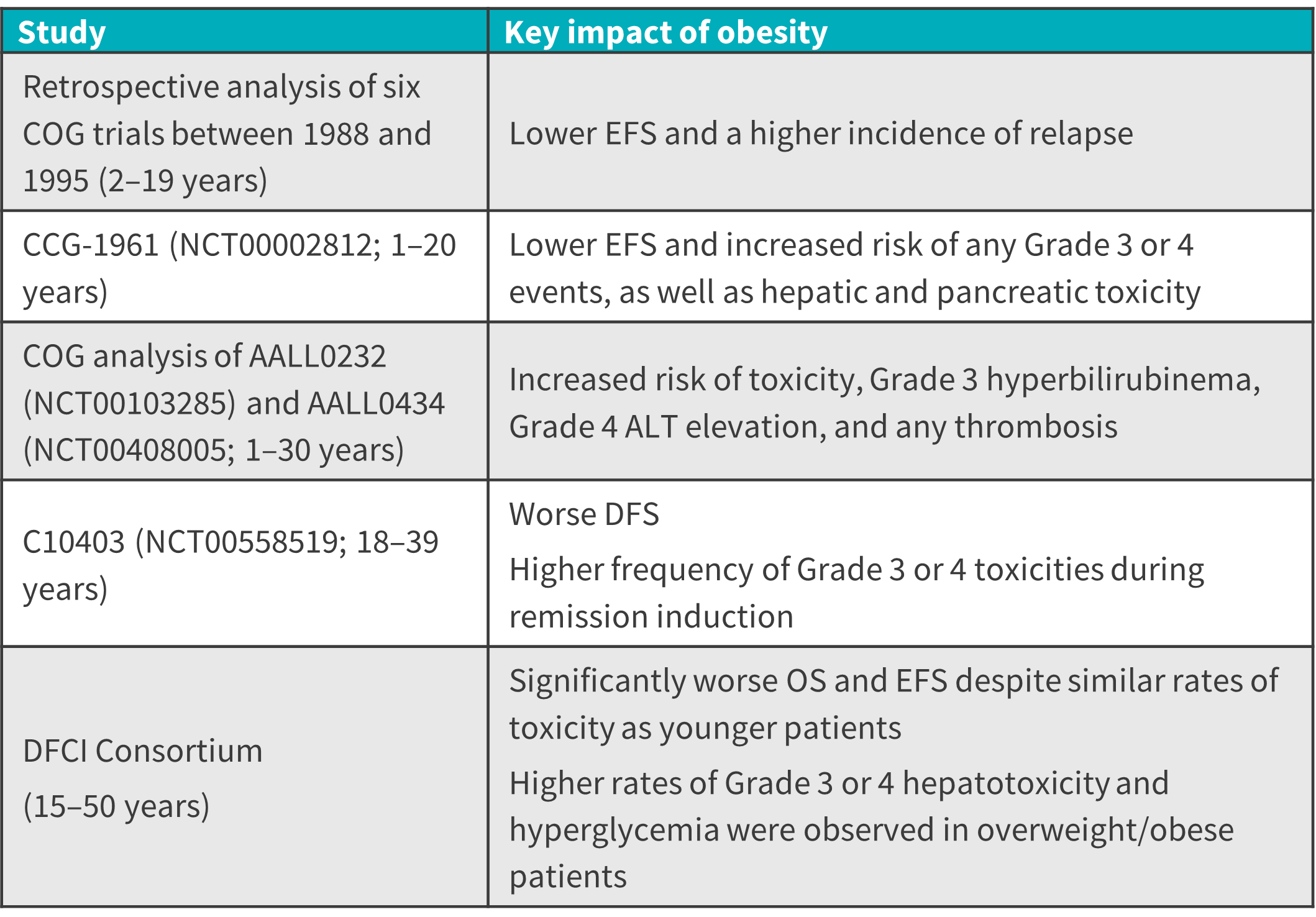 Figure 1. Key findings on the impact of obesity with asparaginase-containing regimens*