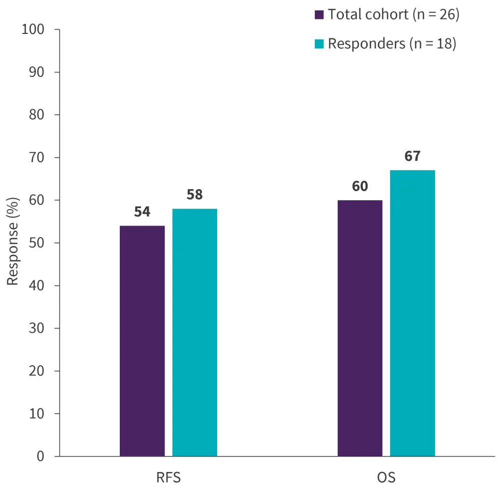 At a median follow-up of 24 months, the median relapse-free survival was 41 months in the total cohort and responders, and the median OS was not reached in the total cohort and responders; 2-year survival rates are reported in Figure 1.