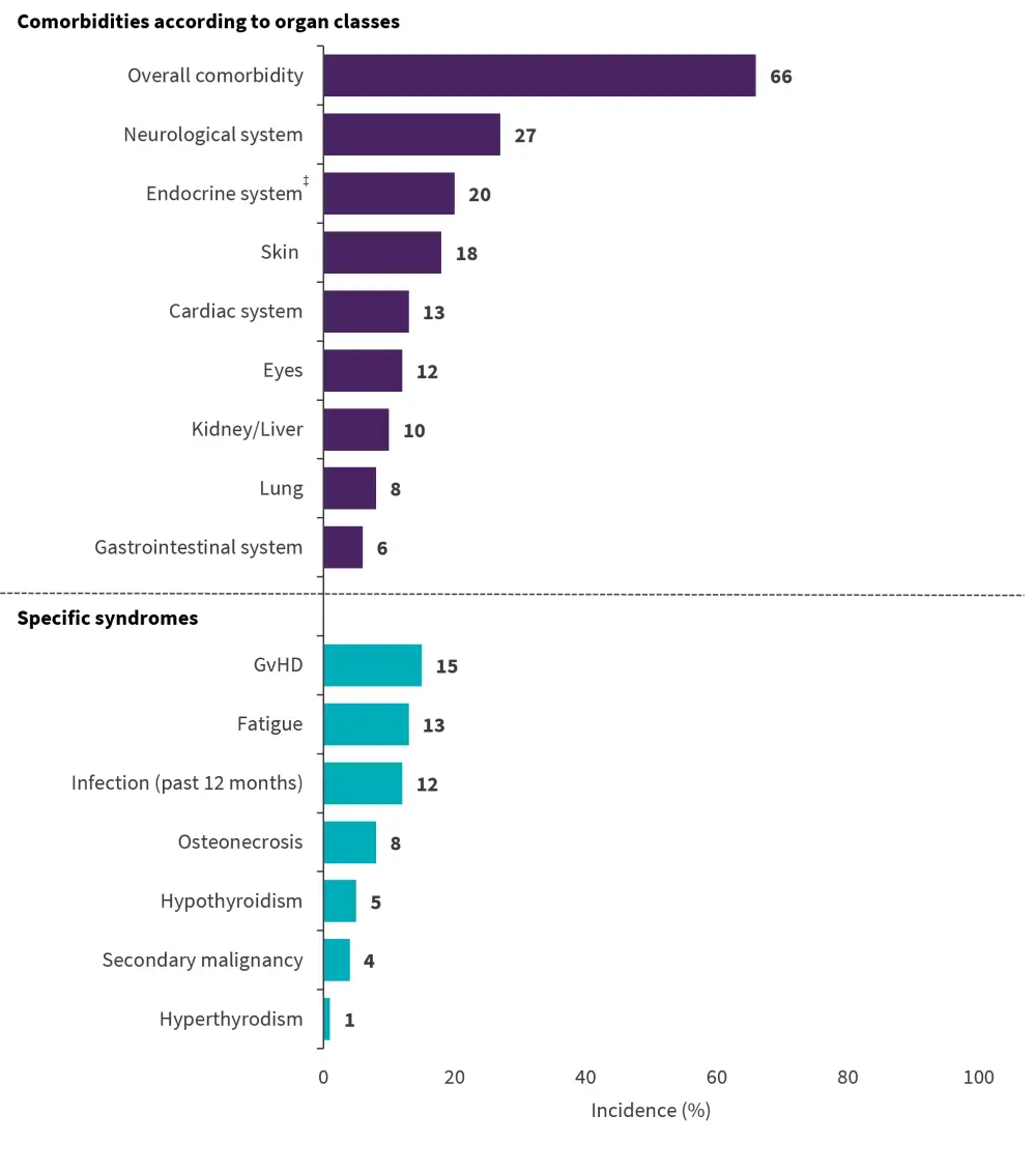 †Evaluable patients per condition were as follows: N = 538 for overall comorbidities, skin, lung, cardiac system, neurological system, kidney/liver, GvHD, osteonecrosis, secondary malignancy and hyperthyroidism; N = 537 for gastrointestinal system, eyes, and hypothyroidism; N = 533 for infections and fatigue; N = 211 for female endocrine disorders; and N = 327 for male endocrine disorders.