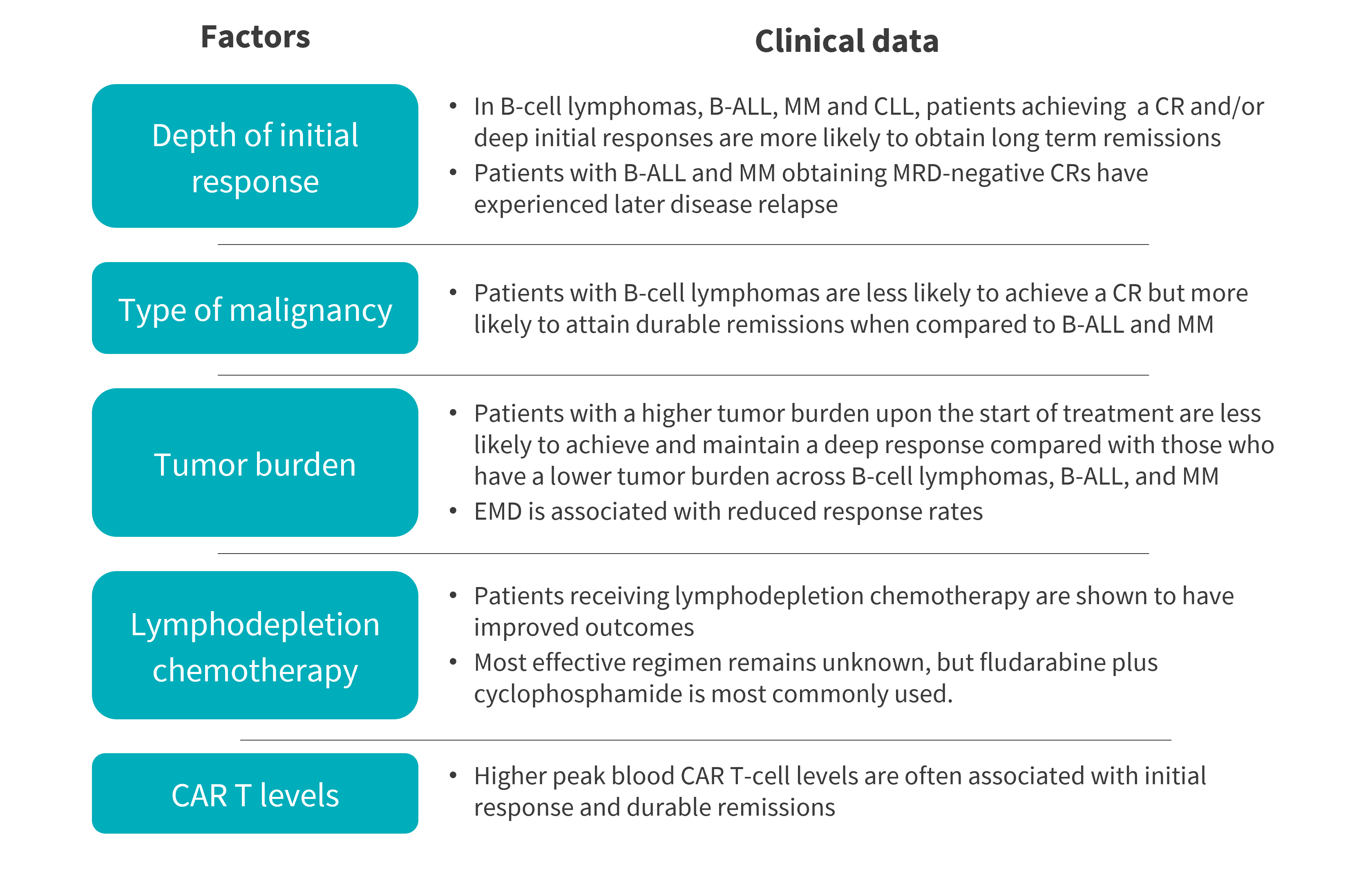 Several factors have been linked with durable remissions following CAR T-cell therapy, including depth of response, type and characteristics of malignancy, tumor burden and location, lymphodepletion chemotherapy, and CAR T-cell levels. Figure 3 summarizes the clinical data for each factor.