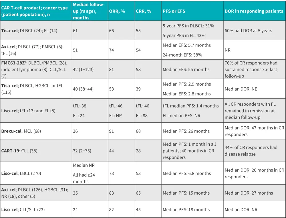 Axi-cel, axicabtagene ciloleucel; CAR, chimeric antigen receptor; CRR, complete remission rate; CLL, chronic lymphocytic leukemia; DLBCL, diffuse large B-cell lymphoma; DOR, duration of response; EFS, event free survival; FL, follicular lymphoma; HGBCL, high-grade B-cell lymphoma; liso-cel, lisocabtagene maraleucel; MCL, mantle cell lymphoma; NR, not reported; PFS, progression-free survival; PMBCL, primary mediastinal large B-cell lymphoma; SLL, small lymphocytic leukemia; tFL, transformed follicular lymphoma; tisa-cel, tisagenlecleucel.