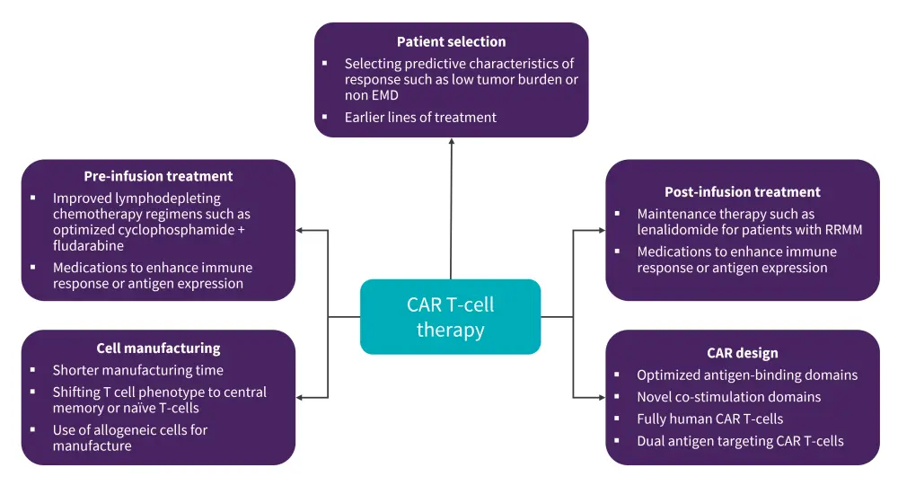 There are ongoing investigational strategies to improve outcomes following CAR T-cell therapy by optimizing all areas of the process, including patient selection, pre- and post-CAR T-cell infusion treatment, and cell manufacturing (Figure 4).