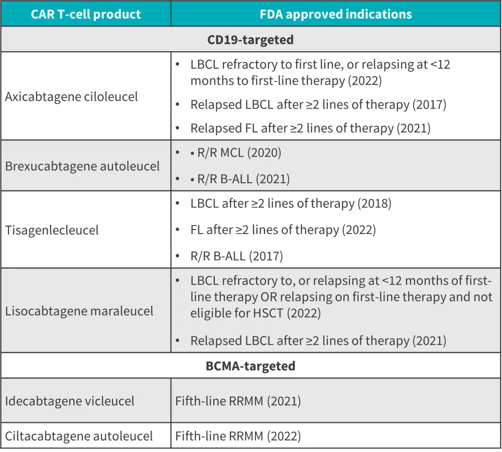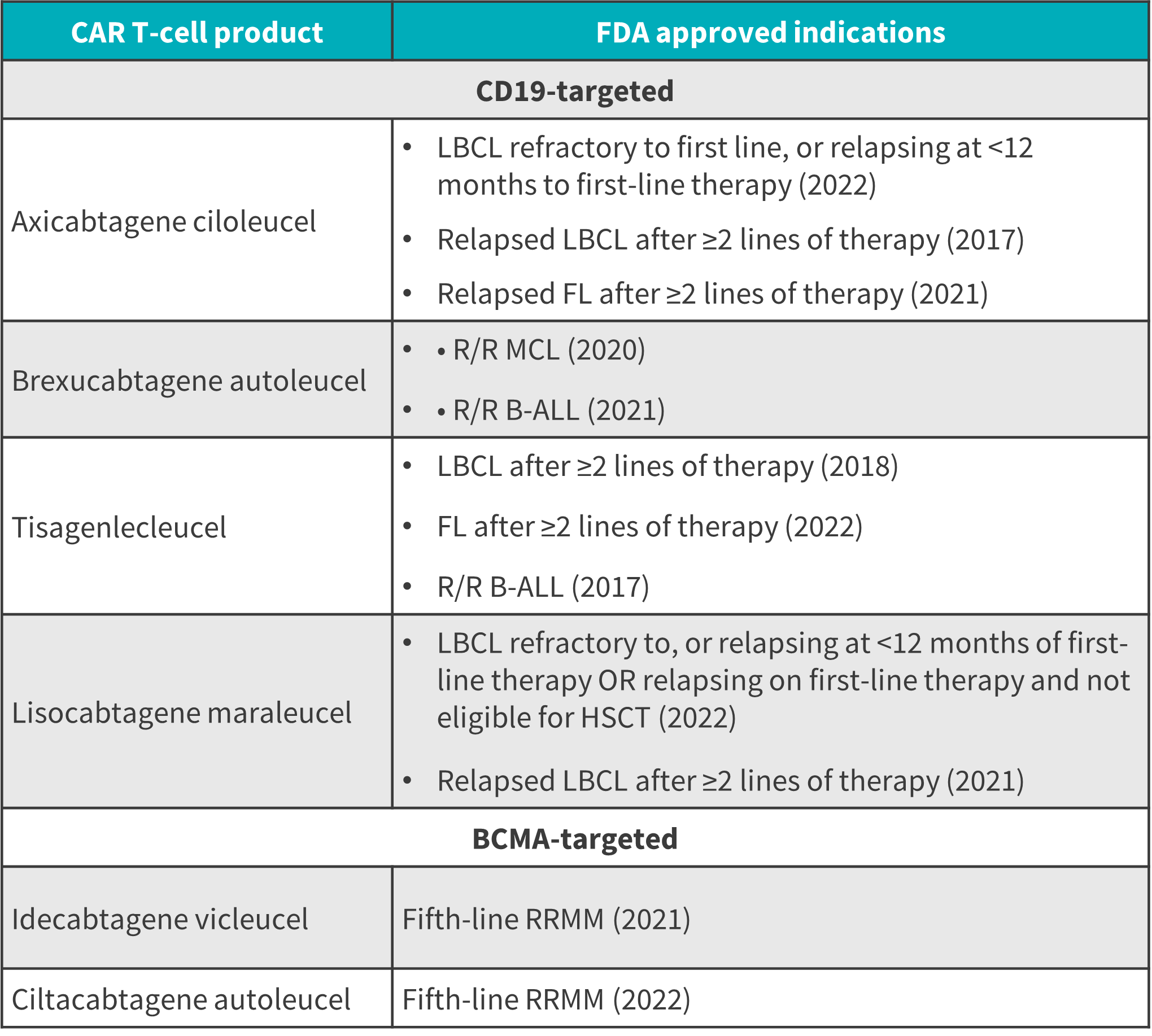 B-ALL, B-cell acute lymphoblastic leukemia; CAR, chimeric antigen receptor; FDA, Food and Drug Administration; FL, follicular lymphoma; HSCT, hematopoietic stem cell transplantation; LBCL, large B-cell lymphoma; MCL, mantle cell lymphoma; R/R, relapsed/refractory; RRMM, relapsed refractory multiple myeloma.