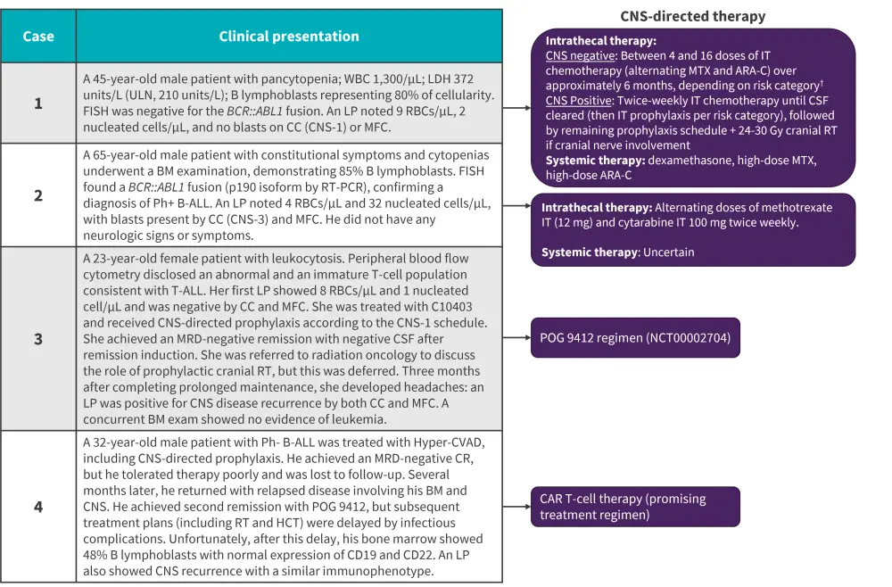 Below, we summarize an article by Kopmar et al.1 on the management approaches of CNS disease in adults with ALL for common and challenging clinical scenarios, including data derived from some pediatric studies. The areas covered include risk factors, diagnostic tools, prevention, and treatment techniques.
