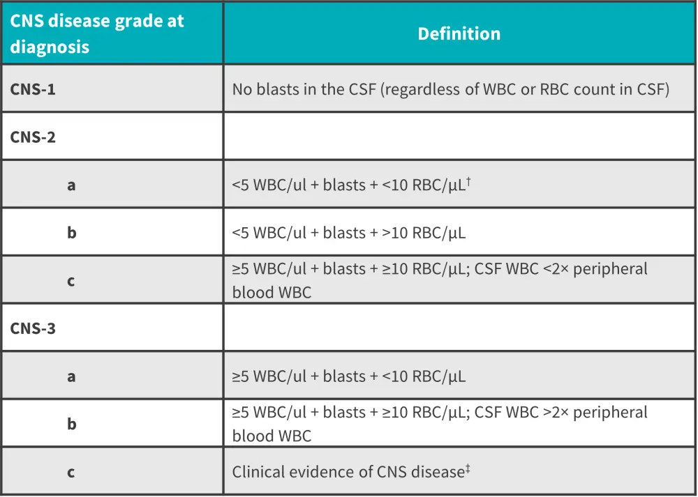 Although conventional cytospin (CC) has historically been used for microscopic CSF examinations, multi-flow cytometry (MFC) has demonstrated a higher sensitivity for detecting CNS leukemia and greater risk-stratification for CNS relapse following treatment in recent studies. A grading system of CNS involvement has been characterized by the Children’s Oncology Group (Figure 1).