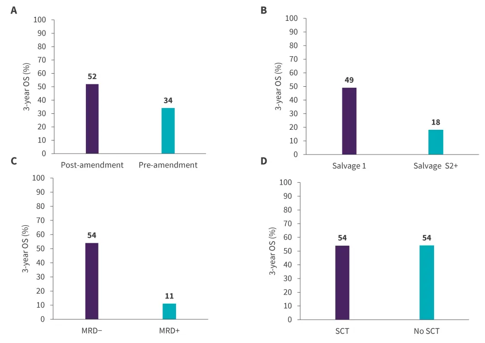 Figure 3. 3-year OS by A treatment modality, B salvage line, C MRD status, and D SCT*†
