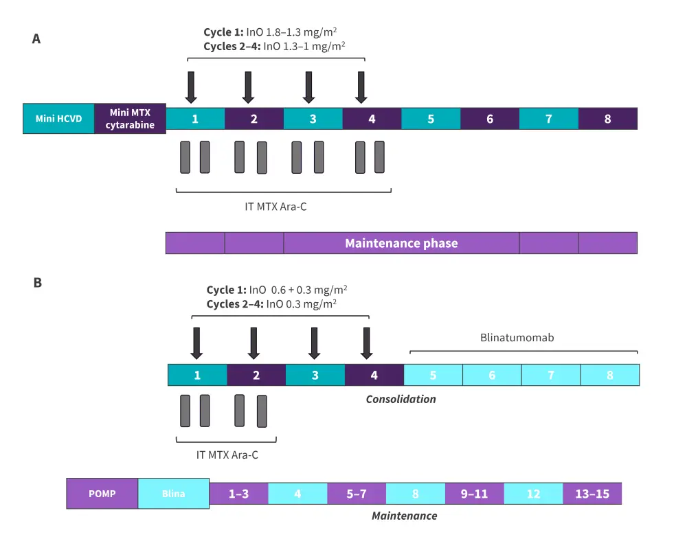AraC, cytarabine; hyper-CVAD, hyperfractionated cyclophosphamide, vincristine, doxorubicin, and dexamethasone; blina, blinatumomab InO, inotuzumab ozogamicin; IT, intrathecal; MTX, methotrexate POMP, 6-mercaptopurine, vincristine, methotrexate, and prednisone.