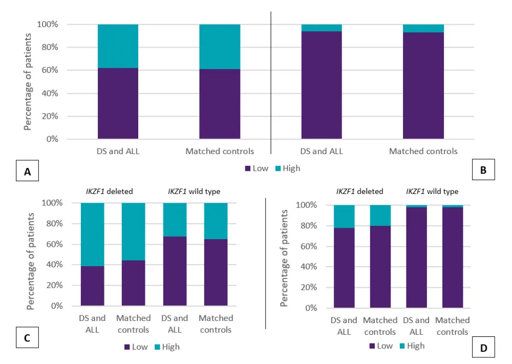 Figure 1. Association between MRD category (low/high) and risk factors for patients with ALL and DS, versus matched controls. MRD categories are shown for patients at A end of induction, B end of consolidation, C end of induction in the IKZF1 deleted and IKZF1 wild-type group, and D end of consolidation in the IKZF1 deleted and IKZF1 wild-type group*
