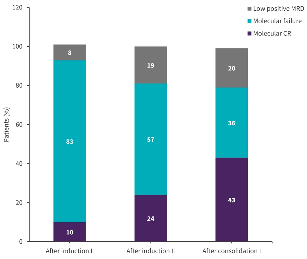 Overall, 165 patients with a median age of 42 years were treated. A high proportion of patients achieved hematologic remissions, with CR rates of 85%, 95%, and 93% after induction I, induction II and consolidation II, respectively. Low mortality was also observed, with early death and failure rates of 5% and 1%, respectively. The CMR after induction I, induction II, and consolidation I are reported in Figure 4. Among the total cohort, the 3-year OS and remission duration rates were 74% and 89%, respectively; the 3-year OS rate for patients receiving SCT was 79%.