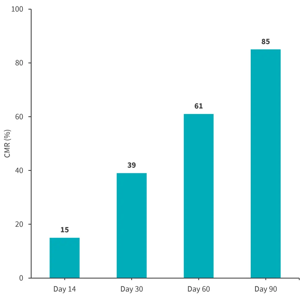 • At a median follow-up of 6 months, PFS and OS rates were 52% and 65%, with higher PFS and OS amongst CMR and MRD-negative responders.