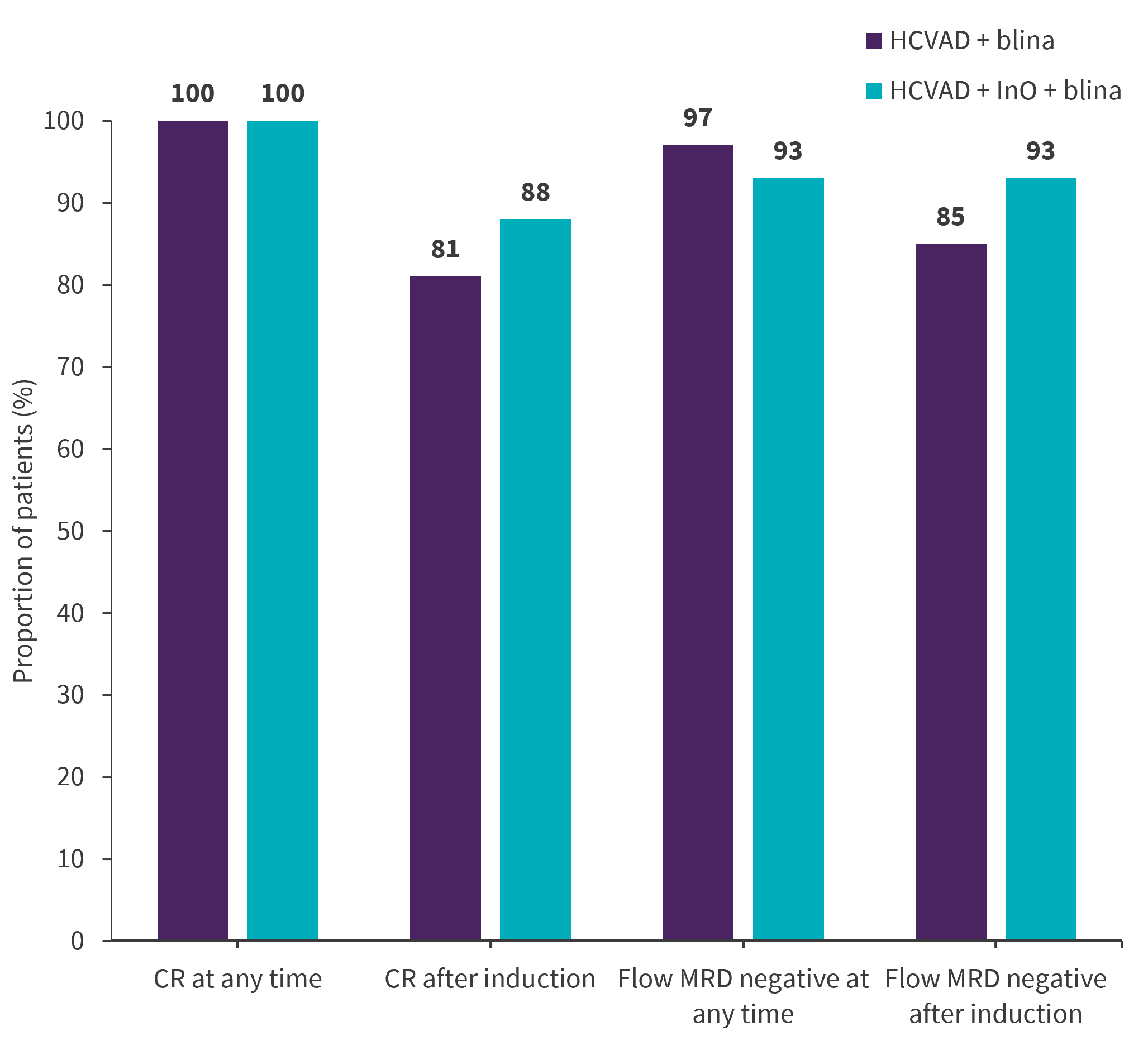 CR, complete response; blina, blinatumomab; HCVAD, hyper-cyclophosphamide, vincristine doxorubicin, and dexamethasone; InO, inotuzumab ozogamicin; MRD, minimal residual disease.