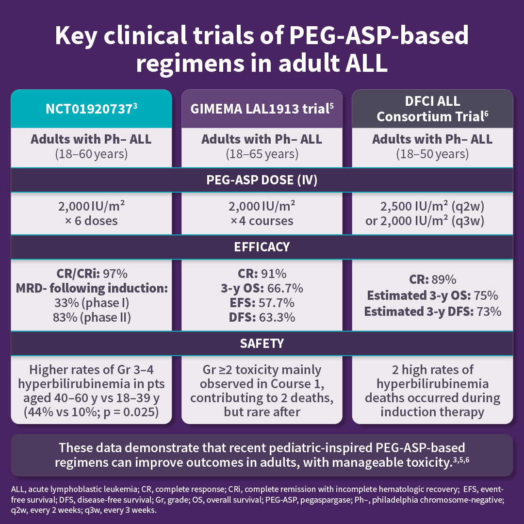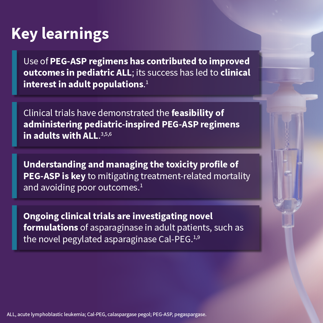 The success of pegylated asparaginase-based regimens in the treatment of pediatric acute lymphoblastic leukemia (ALL), alongside poor outcomes with conventional therapies in adults, has led to clinical trials of pediatric-inspired pegylated asparaginase-based regimens in adults with ALL. These trials have demonstrated the feasibility of pegaspargase-based regimens in adults. However, management of the toxicity profile of pegylated asparaginase-based protocols is key to mitigating treatment-related mortality and avoiding poor outcomes. Ongoing clinical trials are investigating novel formulations of pegylated asparaginases, such as calaspargase pegol, in adult patients with ALL.