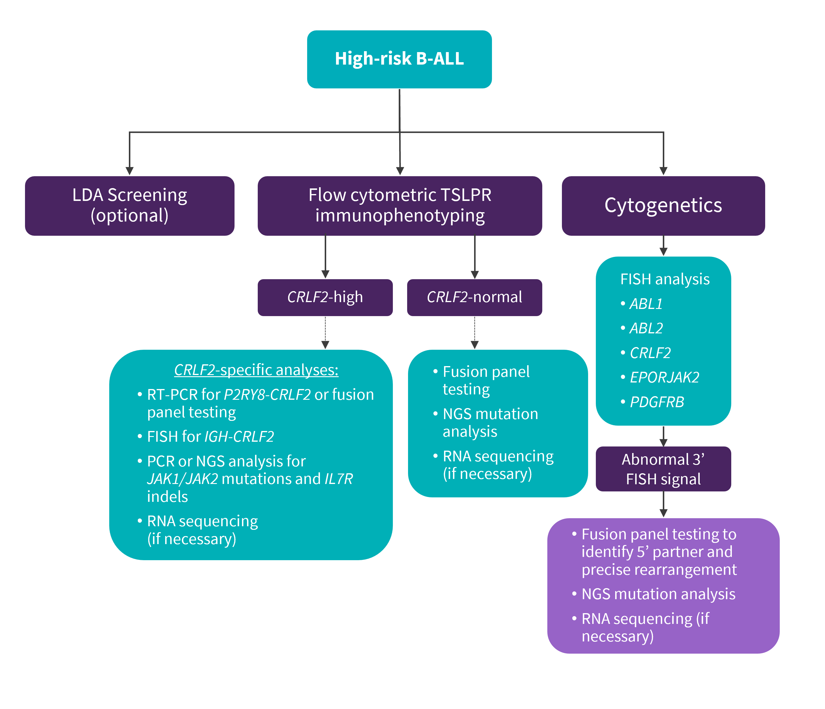 B-ALL, B-cell acute lymphoblastic leukemia; FISH, fluorescence in situ hybridization; LDA, low-density microarray; NGS, next-generation sequencing; PCR, polymerase chain reaction; RNA, ribonucleic acid; RT-PCR, reverse-transcriptase PCR; PDGFRB, platelet-derived growth factor receptor B; TSLPR, thymic stromal lymphopoietin receptor.