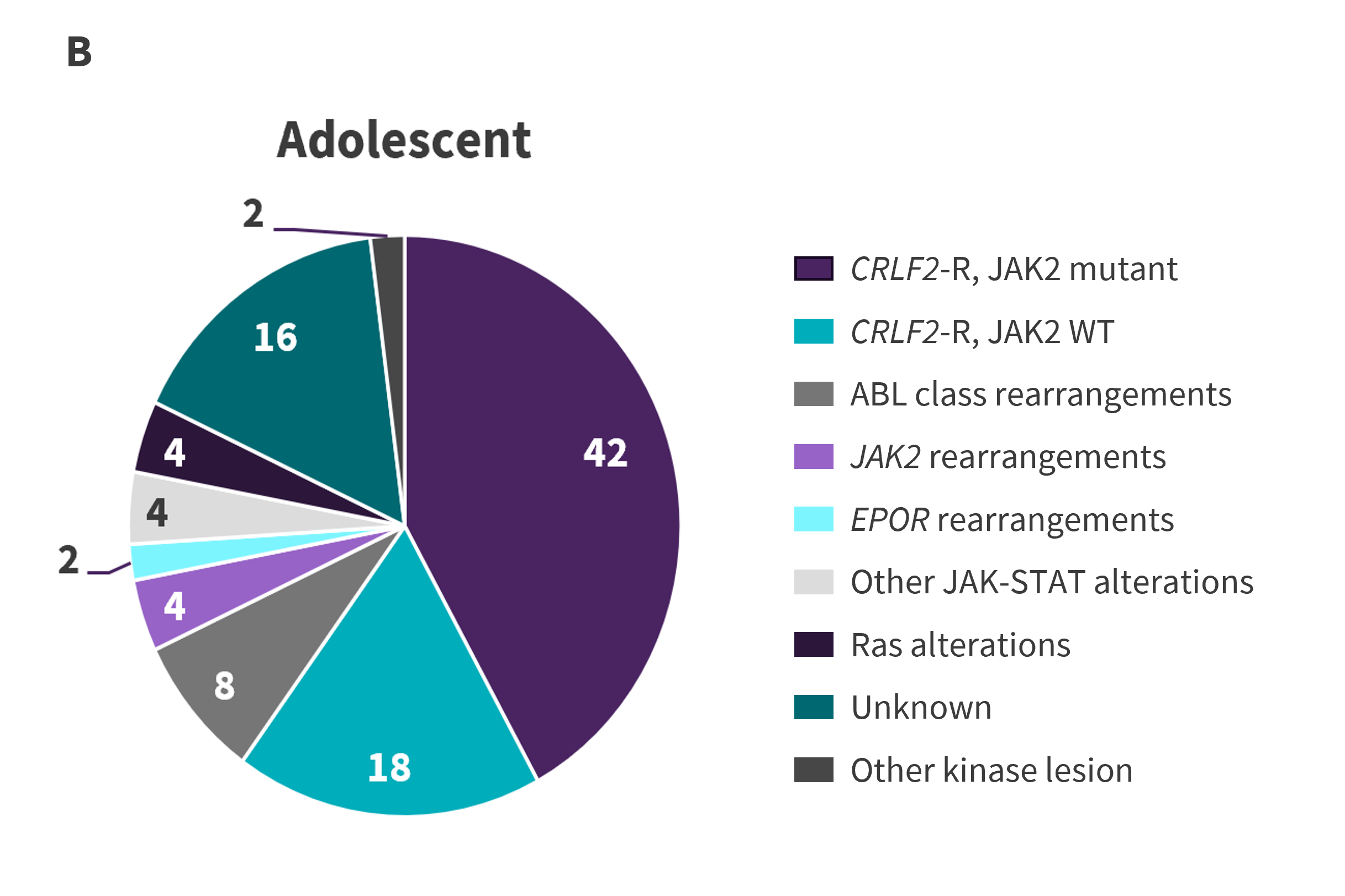 Philadelphia chromosome-like acute lymphoblastic leukemia (Ph-like ALL) is a high-risk subtype of B-cell ALL associated with poor clinical outcomes, including high rates of induction failure, minimal residual disease (MRD) persistence, and relapse. It is characterized by a similar gene expression profile to Philadelphia-positive ALL, but lacks the BCR-ABL1 fusion gene.1 Although Ph-like ALL can occur at any age, it most frequently occurs in adolescents and adults.2