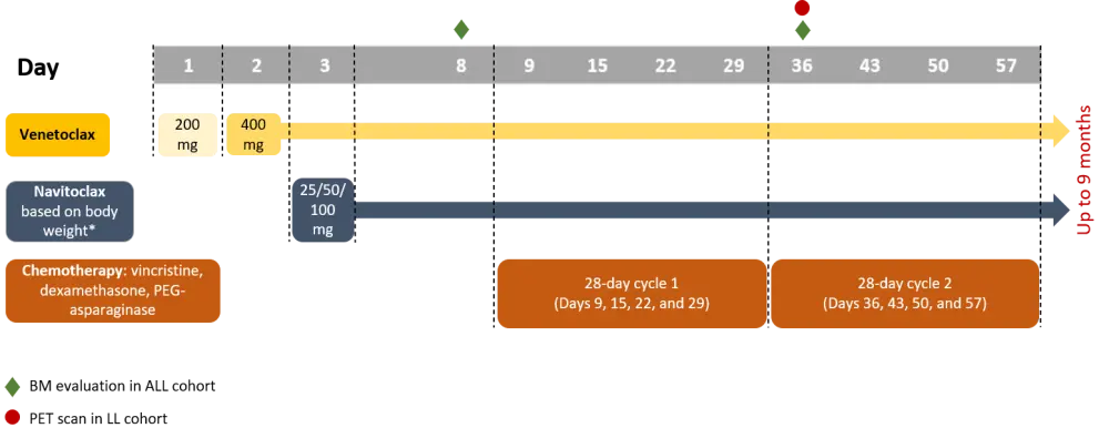 The combination of BCL-2 and BCL-XL inhibitors have shown antileukemic activity in ALL mouse models, and the BCL-2/BCL-XL inhibitor navitoclax was investigated in patients with R/R ALL. However, standard-dose navitoclax treatment has been associated with dose-limiting toxicities (DLTs), primarily thrombocytopenia, and the aim of this previous study was related to navitoclax monotherapy only.