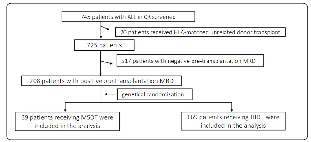 A total of 745 patients with ALL who achieved CR after chemotherapy treatment were included (Figure 1). Initially, 20 patients were excluded because they received HLA-matched unrelated donor transplant, and 517 patients were then excluded due to achieving CR with pre-transplantation MRD negativity. Finally, 208 patients with positive pre-transplantation MRD were genetically randomized to receive HIDT (169 patients) or MSDT (39 patients).