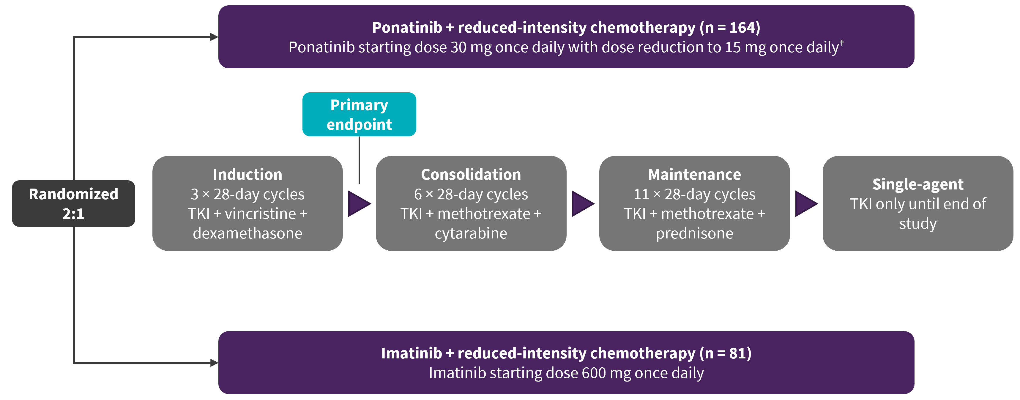 Patients were randomized to either ponatinib + reduced intensity chemotherapy or imatinib + reduced intensity chemotherapy.1 The treatment schema is shown in Figure 1.
