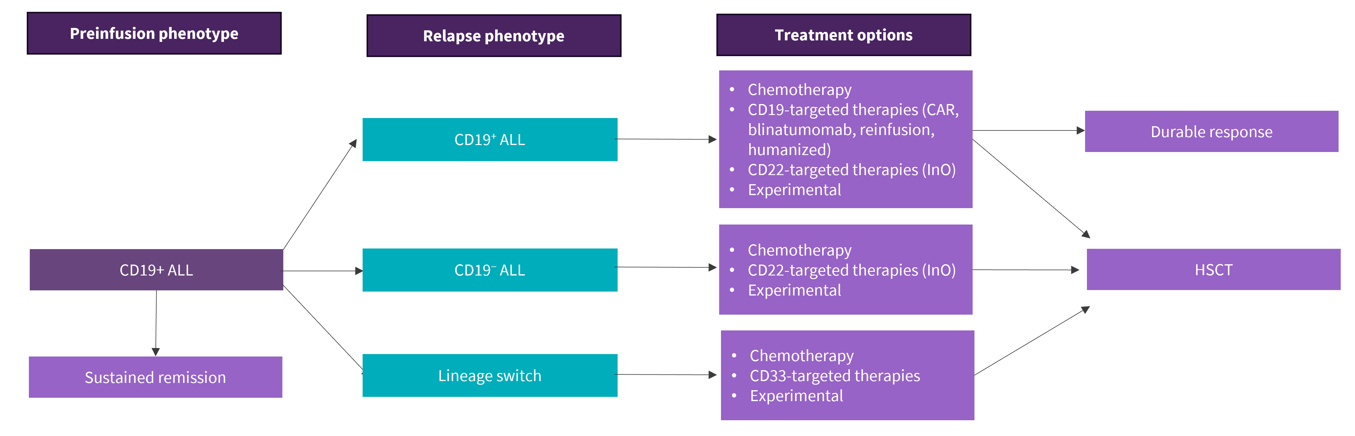 Figure 2 highlights the available post CAR T-cell therapy relapse treatment options based on immunophenotype.