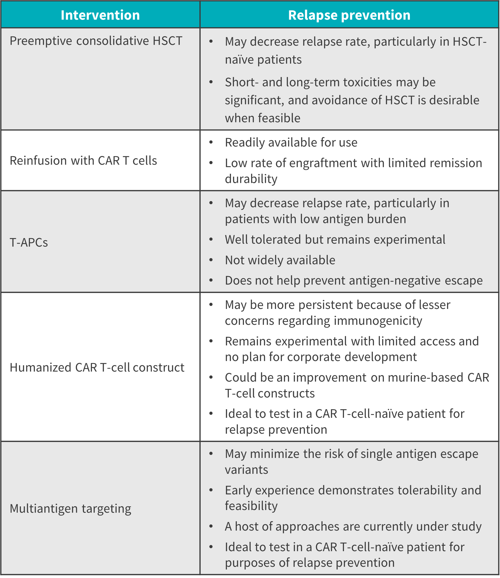 Another approach currently being explored to prevent antigen-positive relapse is the use of fifth-generation CAR T-cell therapies comprising a truncated interleukin-2 receptor B-chain domain with a transcription factor such as 3/5 transcription factor; these constructs have demonstrated improved cell proliferation and persistence when compared with currently available CAR T-cell therapies in preclinical models.5