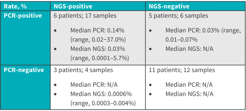 MRD, minimal residual disease; N/A, not available; NGS, next-generation sequencing; PCR, polymerase chain reaction.