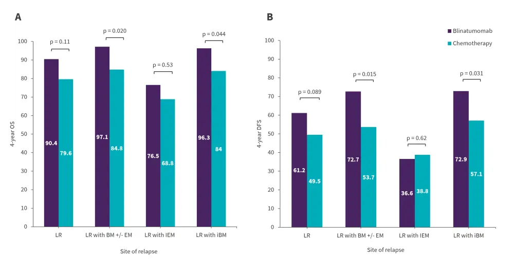Figure 2. 4-year A OS and B DFS rates in blinatumomab vs chemotherapy arm according to the site of relapse*