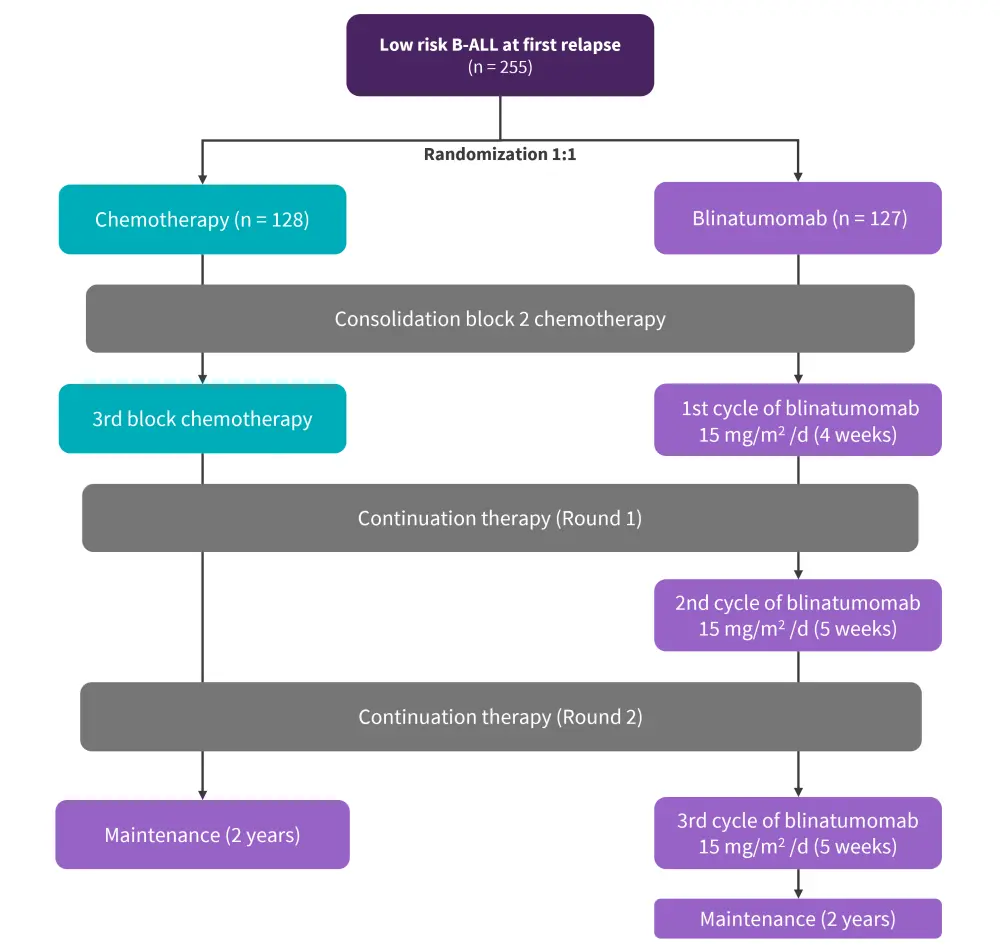 Blinatumomab is a U.S. Food and Drug Administration (FDA) approved bispecific T-cell engager for the treatment of adults and children with relapsed/refractory B-ALL and MRD-positive B-ALL. Previous results from the AALL1331 Children’s Oncology Group study (NCT02101853) demonstrated improved OS and reduced toxicities with blinatumomab in high- and intermediate-risk patients at first B-ALL relapse.1