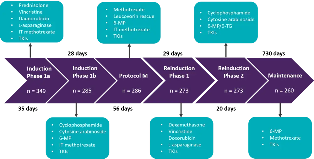 TKI, tyrosine kinase inhibitors (imatinib or dasatinib); 6-MP, 6-mercaptopurine; 6-TG, 6-thioguanine; IT, intrathecal.