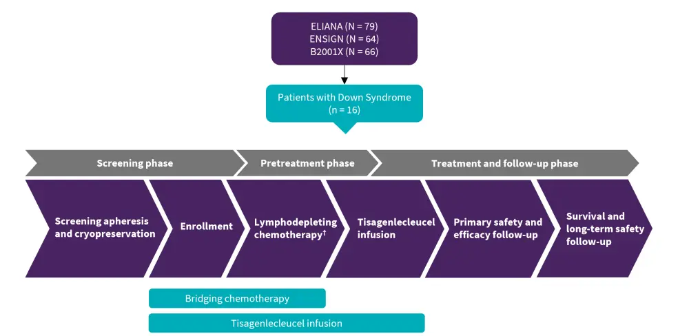 Patients with DS-ALL aged 5–22 years and treated with tisagenlecleucel were included in the post hoc analysis. A total of 16 patients with DS-ALL were included from two phase II trials (ELIANA, ENSIGN), and a phase IIIb managed access protocol (B2001X) (Figure 1). One prospective patient with DS-ALL in the ELIANA trial underwent leukapheresis and exhibited successful manufacturing but died due to disease progression prior to receiving tisagenlecleucel infusion.
